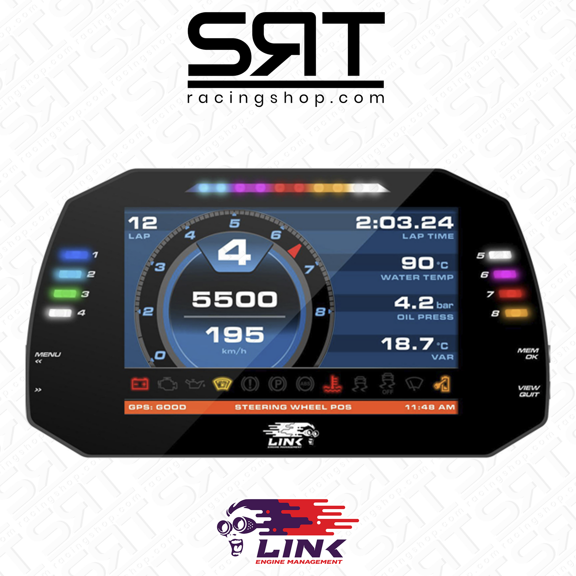 The Link MXG Strada Race Edition dashboard features customizable shift lights, eight flexible warning LEDs and a high-contrast 7" TFT display. Visual quality is always optimal as the ambient light sensor automatically adjusts the display brightness.